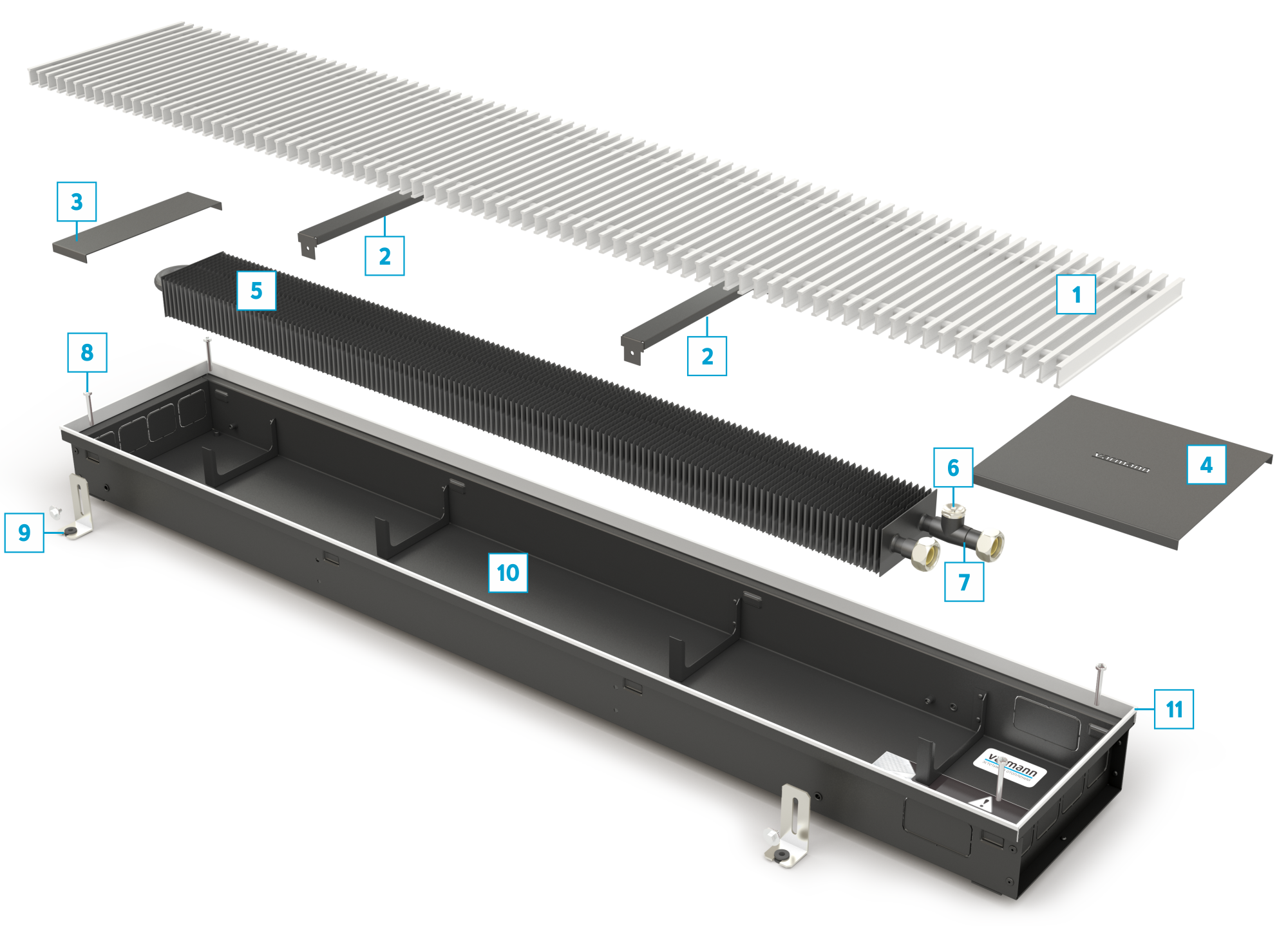 из оцинкованной стали, окрашен порошковой краской в матовый чёрный или из нержавеющей стали с выламываемыми заглушками для возможности размещения трубной подводки с любой стороны конвектора