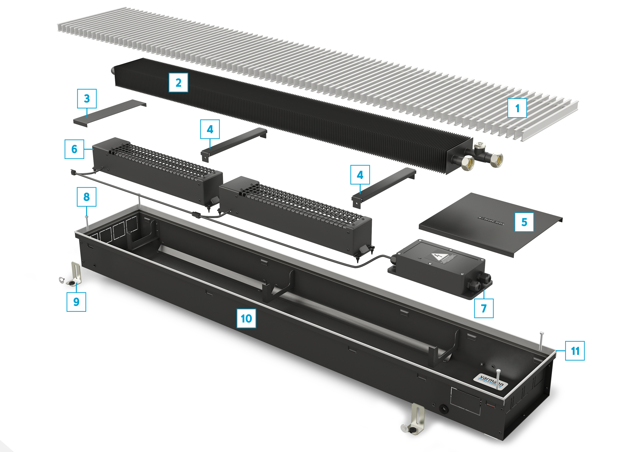 из оцинкованной стали, окрашен порошковой краской в матовый чёрный или из нержавеющей стали с выламываемыми заглушками для возможности размещения трубной подводки с любой стороны конвектора