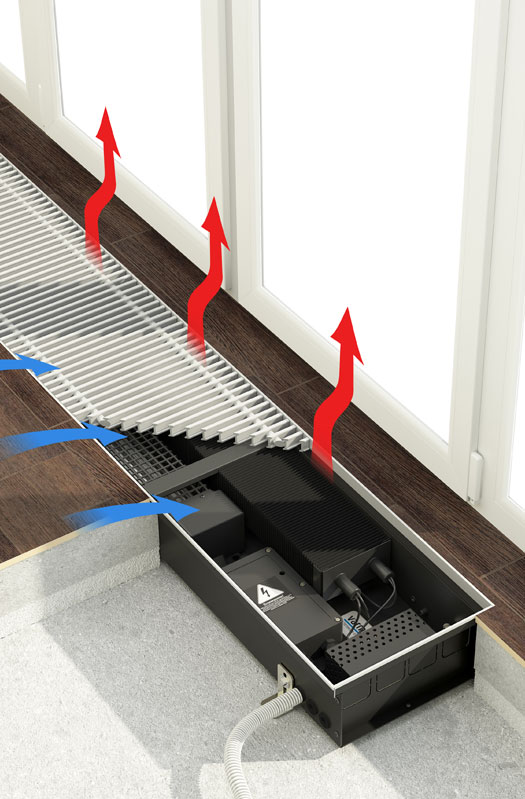 Встраиваемый в пол конвектор Qtherm Electro — это отопительный прибор с принудительной конвекцией, с тангенциальными вентиляторами. В теплообменнике используются электрические нагревательные элементы. В переходные периоды отопительного сезона конвектор может работать без вентилятора за счет естественной конвекции