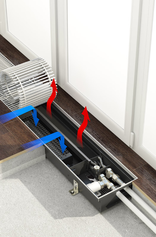 Стальной корпус конвектора толщиной 1мм, наличие ребер жесткости позволяет исключить деформацию корпуса при заливке стяжкой